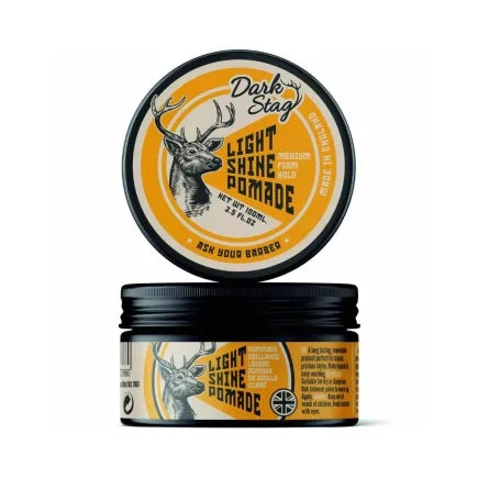 Some styles demand respect. Dark Stag Light Shine Pomade answers that call with a medium to firm hold and perfectly balanced shine. Vastly versatile with excellent distribution in the hands, this pomade is ideal for making sure classic styles look and stay sharp. Long lasting with an addictive black pomegranate fragrance and water soluble for easy wash out