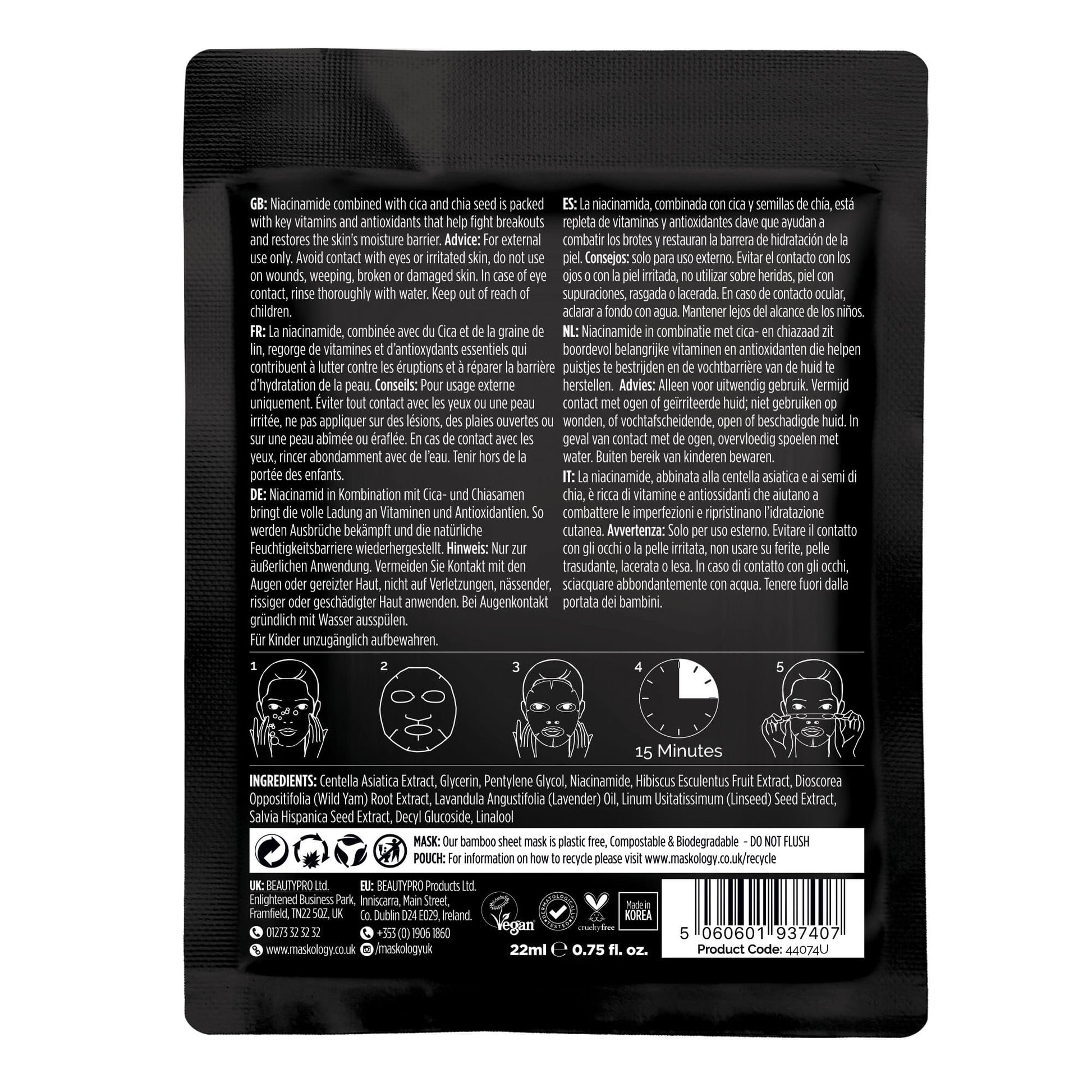 The +maskology NIACINAMIDE Professional Sheet Mask is a blemish control formula that balances the skin, improves texture and prevents breakouts. Harnessing the power of niacinamide, CICA and Chia Seed, this serum is the perfect choice for those struggling with acne or blemish prone skin as it’s packed full of vitamins and antioxidants to heal, soothe and protect the skin.